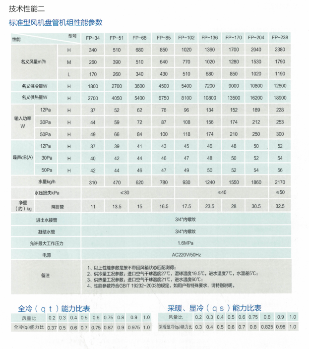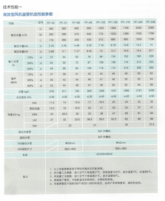 風機盤管機組主要由離心風機、盤管換熱器等構成,是中央空調系統的末端裝置,它廣泛應用于賓館、飯店、工廠、醫院、展覽館、商場以及辦公大樓等多房間或大空間工業和民用建筑的空調場合,以滿足降溫去濕、采暖等要求,為人們創造一個清新、寧靜、四季如春的工作和生活環境。 本公司風機盤管機組經過設計優化,盤管性能大幅提高,盤管機組分為高效型和標準型兩種;其中標準型風機盤管能滿足國標要求的各項參數,高效型風機盤管的性能參數優于國標要求20%以上。 FP-WA臥式暗裝風機盤管,此機組輪廓高度低,可理想的放入天花板內,結合室內裝修,配上出風口,是賓館、飯店、辦公室等理想的空調設備。 直流無刷風機盤管 使用直流無刷電機,實現高中低三檔調速以及無級調速的多樣化控制。 1、工作轉速范圍大,可滿足各種風量模式下的轉速要求。 2、隨著電機轉速降低,風量也隨之變化,這一變化降低了能耗,從而達到節能的效果。 水路控制系統 兩通或三通開/關型水路控制系統包括電動執行器,閥及其相關組件。該控制系統由工廠直接安裝在帶加長水盤的盤管機組上,通過控制冷水或熱水系統的開啟與關閉來實現室內溫度的自動調節。 1、安裝方便,現場只需連接水管及電源,即可投入使用。 2、設計緊湊,充分利用加長水盤空間,不需要改變機組尺寸。 FP-WA臥式暗裝風機盤管機組特點 1、安全可靠,壽命長 每臺盤管換熱器都經過壓力檢漏;進出水接管(集水頭采用鍛黃銅結構,可靠耐用);凝水盤噴塑處理,不生銹,全部材料系仿活型;電動機采用超低噪聲滾動軸承,無需用戶加油維修,使用壽命可達35000小時;電動機細長軸徑特殊處理無銹蝕。 2、效率高,能量組 風機盤管采用無縫紫銅管串套搞笑的雙翻邊鋁肋片并肋緊成一體,傳熱效率高,冷(熱)量富足,標準型盤管能滿足國標要求性能,高效型盤管性能達到了國際領先水平。 3、風量大,噪音低 風機盤管采用超廣角蝸殼,鋼板制多葉離心風輪,風輪與電動機可有多種優先匹配,以滿足風機盤管機組各個規格的需要。 4、選用靈活 考慮安裝工地各有其特殊性及場地限制等原因,本公司提供不同長度水盤供客戶選擇。 1、標準水盤——使所需安裝位置縮小,特別適用于安裝空間狹小的場所。 2、加長水盤——能更好的接住閥門漏水和凝結水。 風機盤管安裝、使用說明 1、風機盤管安裝在水平面上,保持垂直,不得傾斜;臥式機組,安裝時四個吊點一定要保持機組水平,防止凝結水管一端抬高造成凝結水外溢。 2、進出水管路應裝有閥門,以便于調節和檢修,并且必須注意進出水管的清潔和保溫工作,凝結水塑料管不得壓偏,不得有死彎,以保證使用時凝結水暢通。 3、機組三檔調速開關,開啟時應從高檔啟動,然后進行其他檔次的選擇,多機共用時,必須單機控制。 4、機組用電源:單相220v±10%,50Hz交流電機殼應安裝接地線,若機組啟動有困難,務必注意檢查電源是否正常,風輪與風機蝸殼是否接觸,機組安裝時必須注意外殼,換熱器肋片和風機等不要碰壞以免影響美觀和性能。 5、機組夏季供冷水溫度不得低于7℃,冬季供熱水溫度不得高于80℃,使用冷、熱水必須考慮個地方水質情況進行軟化處理。 6、機組允許使用壓力最大1.6MPa。 7、過濾器要進行定期清洗,保持清潔,確保傳熱良好。 8、接通電源后應先開動風機觀察其旋轉方向是否正確。 9、機組如果裝在暗處,要設有檢修門,便于常年維護。 10、機組在維修時應切斷電源。 11、卡式風機盤管安裝、使用詳見隨機說明書。 12、隨著我廠技術水平的不斷提高,對產品規格本廠有權更改,若機組的性能參數更改,以隨機的技術文件為準,不另行通知。 訂貨指南 1、選用風機盤管機組,請明確產品的規格型號及其進出水的左右式。 2、臥式暗裝風機盤管機組選配回風箱時,請注明回風方式是下回風還是后回風。 3、臥式暗裝風機盤管機組分低靜壓(12Pa)和高靜壓(30Pa、50Pa)三種,請在訂貨時注明。如無特殊要求,則按低靜壓型供貨。