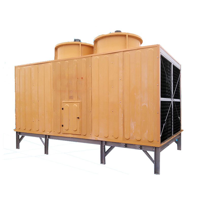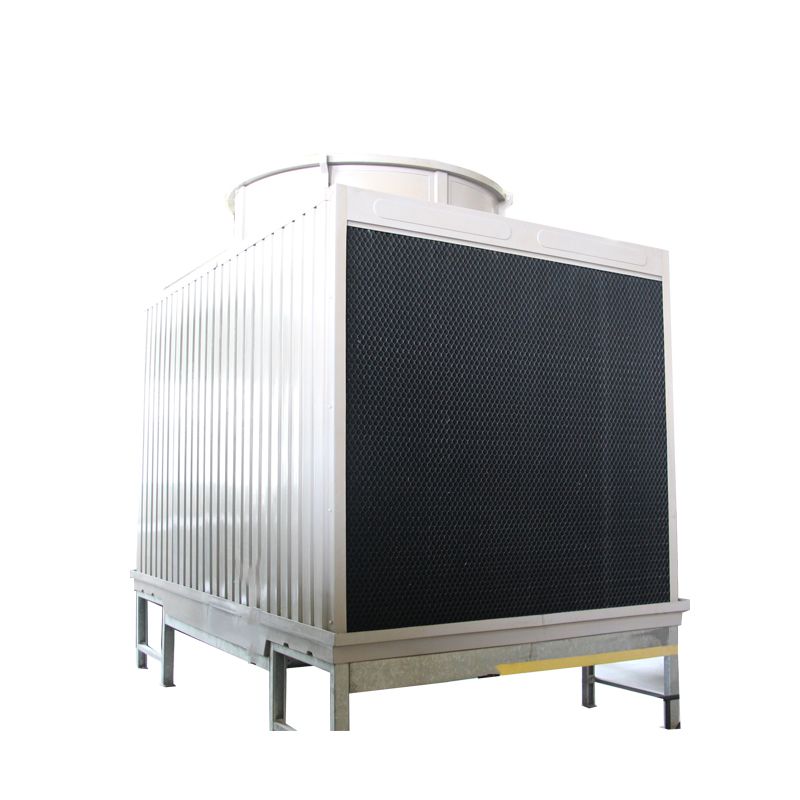 方形橫流式玻璃鋼冷卻塔采用兩側(cè)進風,靠頂部的風機,使空氣經(jīng)由塔兩側(cè)的填料,與熱水進行介質(zhì)交換,濕熱空氣再排向塔外。填料采用兩面有凸點的點波片,通過安裝頭使點波片粘結(jié)成整體,以提高剛性,兩面的凸點還可避免直接滴水,因此提高了水膜形成能力,填料尾部設有收水措施。