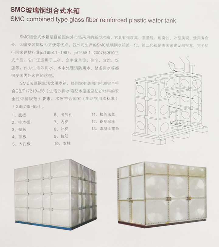 SMC組合式玻璃鋼水箱是目前國際上采用的新型水箱。其特點是采用食品級樹脂,因此水質好,清潔無污染;具有強度高,重量輕,耐腐蝕,外型美觀,使用壽命長,保養管理方便等特點。