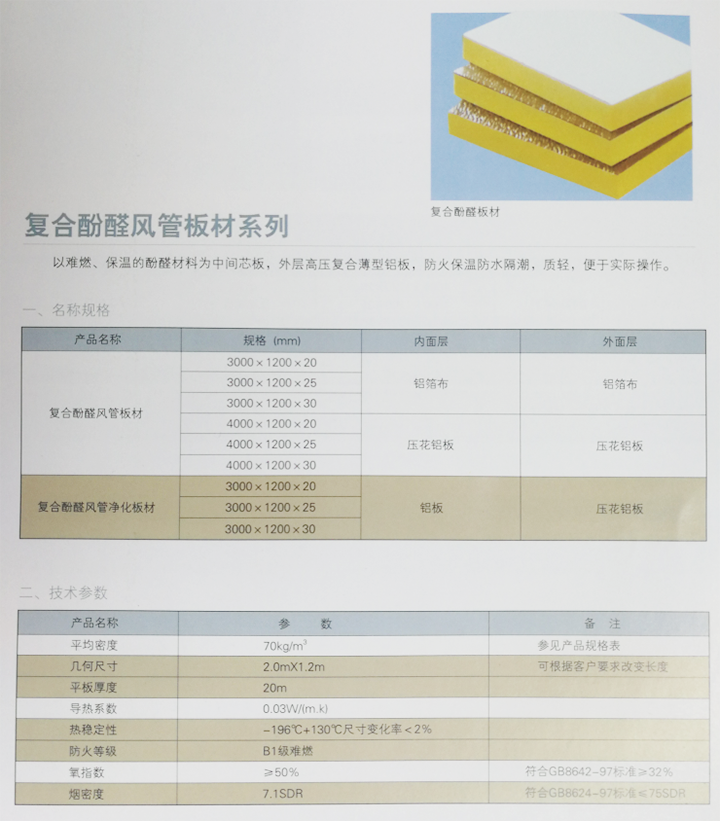 酚醛復合風管中間層為酚醛泡沫,內外層為壓花鋁箔復合而成。酚醛泡沫板與鋁箔復合制成夾芯板,然后加上專用法蘭配件,制成的酚醛復合風管用于中央空調通風。